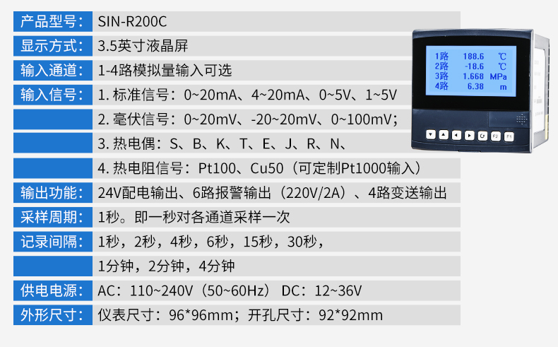 SIN-R200C顯示采用 3.5 英寸 高分辯率點陣式白屏黑字液晶屏,軟件上引入中文WINDOWS 的框架思路,并采用了數據壓縮技術。帶 USB 數據轉存功能,存儲時間最長可達 720 天。儀表全面采用了表面貼裝工藝,并采用多保護和隔離設計,抗干擾能力強,可靠性高。儀表可同時輸入 4 路萬能信號,輸入通道相互隔離,并具有報警控制、模擬變送、RS485/232 通訊等輸出功能,是一款功能齊全的漢顯儀。