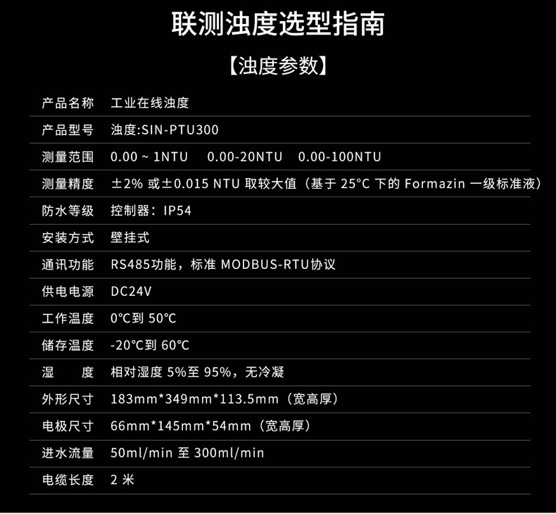 聯測_SIN-PTU300三個量程段規格,分別為0-1NTU量程段,0-20NTU量程段,0-100NTU量程段,其中0-1NTU量程段主要應用出水濁度低、測量要求高的場合,其最低檢出限為0.015NTU,可穩定監測<0.1NTU水質,可配套小型凈水設備。